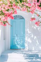Een stralend blauwe entree harmonieert perfect met de tere roze bloemen die er zachtjes boven hangen. De witte achtergrond straalt een kalme sereniteit uit, terwijl het licht speels door de takken danst. Deze plek lijkt verhalen te fluisteren en nodigt je uit om de geheimen achter de uitnodigende deur te ontdekken.