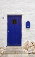 Een blauwe deur en een blauwe brievenbus op een witte muur in Sitges aan de Costa Brava, Catalonië, Spanje. Fotografisch minimalisme in het blauw.
