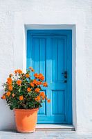 Een helder hemelsblauw contrasteert fel met de warme, witte muur, terwijl levendige oranje bloemen vrolijk uitlopen in een grote, terracottakleurige pot. Dit uitnodigende tafereel geeft je zin om het geheim achter de deur te ontdekken en je onder te dompelen in een wereld vol kleuren en verhalen. Het geheel straalt een mediterrane…