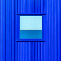 Dit abstracte fotowerk toont een felblauwe muur met strakke, verticale lijnen en een centraal geplaatste rechthoekige raamopening. De bovenkant van het raam is lichtblauw, terwijl de onderkant een diepere, donkere blauwtint heeft. De eenvoud en symmetrie van deze compositie creëren een visueel rustpunt dat de kijker uitnodigt om de subtiele variaties in kleur en vorm te waarderen.