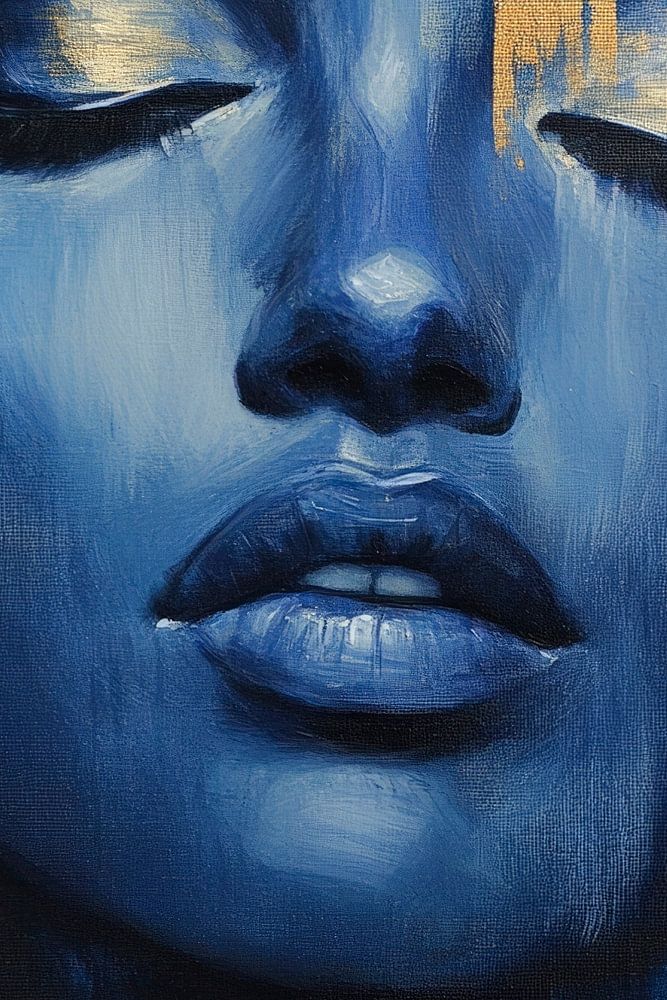 Een diepblauw portret van een vrouw ontvouwt een fascinerende rust en gratie. Haar gesloten ogen en zachte, expressieve gezichtsuitdrukking nodigen uit tot contemplatie en brengen een gevoel van intimiteit over. De gouden accenten zorgen voor levendige contrasten en voegen een luxueus tintje toe, perfect voor een stijlvolle slaapkamer of moderne woonkamer.