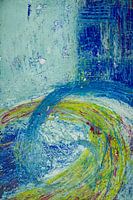 Blue and Yellow Wave Abstract - Levendige wervelingen van blauwe, gele en rode kleuren domineren de voorgrond en suggereren een dynamische beweging naar het midden van de compositie. Overal in het werk is een ruwe textuur te zien, met zichtbare penseelstreken en plekken waar de verf dik lijkt te zijn opgebracht.