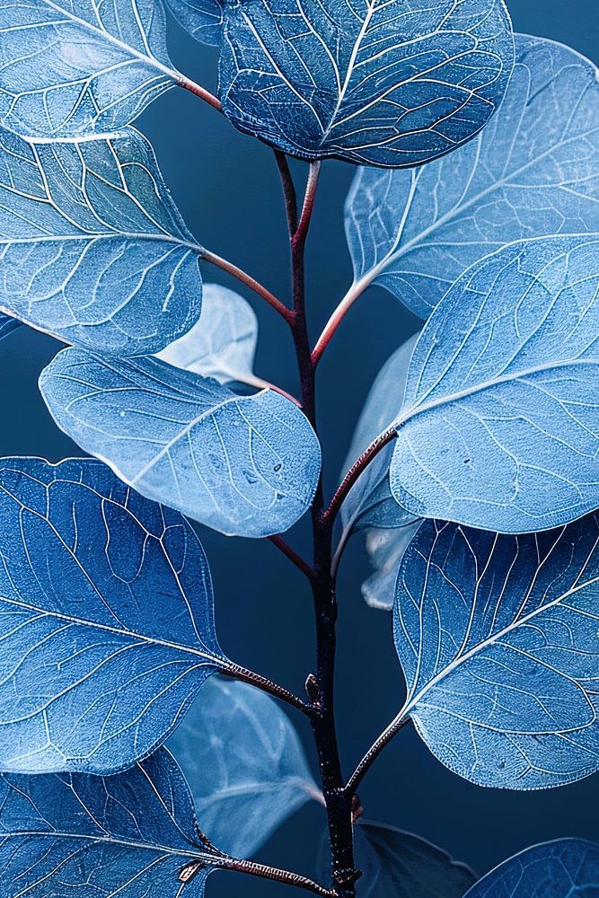 Deze artistieke weergave van eucalyptusbladeren straalt een serene en minimalistische charme uit. De subtiele overgang van koele blauwtinten naar zachte witte highlights, gecombineerd met de delicate zichtbaarheid van bladnerven tegen een diepzwarte achtergrond, maakt dit een opvallend stuk voor elke moderne interieurinrichting. Het gebruik van kleur en contrast benadrukt de eenvoudige schoonheid van de natuur en creëert een rustgevend visueel spektakel dat perfect zou passen in een rustige slaapkamer of een stijlvol kantoor.
