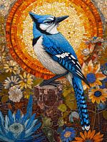 blauwe gaai vogel in zonsondergang met kleurrijke bloemen