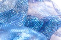 Dit werk toont een abstracte close-up van een netachtige, glinsterende metallic stof in verschillende tinten blauw. Het oppervlak reflecteert licht op een manier die fijne gaasstructuren zichtbaar maakt. Gekleurde cirkels van licht worden gecreëerd in de zacht getekende gebieden door gerichte scherptediepte - een creatieve techniek uit de fotografie die bekend staat als bokeh. Deze techniek leidt het oog weg van het figuratieve en naar de perceptie van licht, kleur en structuur.