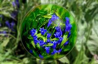 Blik door een glazen bol op een blauw bloeiende gentiaan