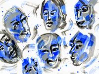 Schilderij van verschillende, blauwe gezichten die samen een ritmische compositie vormen.