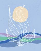 Minimalistisch zeelandschap met abstracte blauwe golf vormen, een licht gele zon vorm en een lijntekening van een abstracte zeeplant in het wit. De vormen en de lichtblauwe achtergrond zijn met aquarelverf geschilderd met een zichtbare textuur.