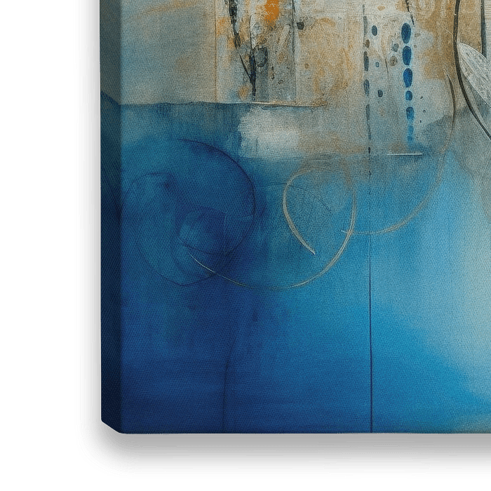 Een abstract schilderij in blauw, beige, wit en goud met cirkels en lijnen straalt balans en levendigheid uit. Een tijdloos abstract werk dat energie en verfijning oproept.