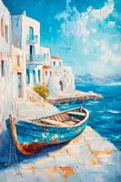 Een schilderachtige havenidylle ontvouwt zich: zachte golven spelen rond een voor anker liggende, versleten boot in een stralend blauw, terwijl de lucht speelt met heldere tinten wit en blauw. De witte gebouwen met hun charmante balkons stralen een tijdloze rust uit en lijken verhalen te vertellen uit vervlogen tijden. Een plek vol…