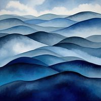 Zachte golven van blauwe tinten creëren een rustige reeks glooiende heuvels of waterpatronen en roepen een gevoel van kalmte en sereniteit op. Schakeringen gaan over van licht naar donker en suggereren diepte en dimensionaliteit in het abstracte landschap.