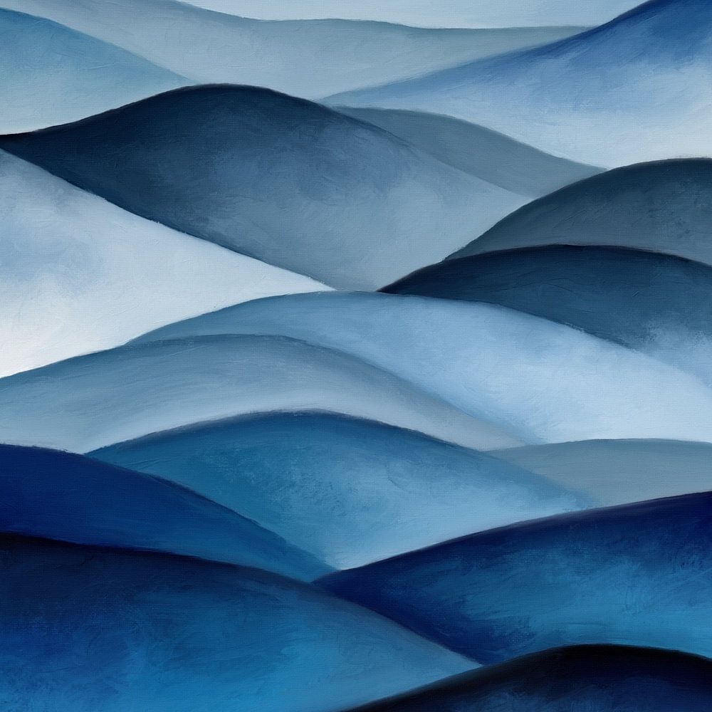 Zachte golven van blauwe tinten creëren een rustige reeks glooiende heuvels of waterpatronen en roepen een gevoel van kalmte en sereniteit op. Schakeringen gaan over van licht naar donker en suggereren diepte en dimensionaliteit in het abstracte landschap.