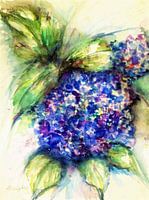 Aquarel van een blauwe hortensia. Hortensia's zijn er in heel veel verschillende kleuren , het een vaste plant met grote bloemen en bloeit van de lente tot begin van de herfst. De bloemen kunnen ook worden gedroogd en zijn dan heel decoratief.