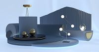 Drie dimensionaal (3D) abstract design van een blauwe kamer met plateaus, bollen en verlichte bollen op kubische vormen met koperen details en verborgen licht