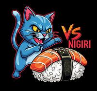 Illustratie van een boze blauwe kat klaar om een stuk zalm nigiri sushi te slaan. De achtergrond is zwart, met "VS Nigiri" tekst.