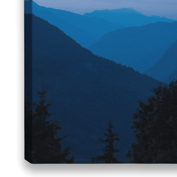 Gelaagde silhouetten in de bergen van de Franse alpen. Een verloop van donker naar licht in blauw terwijl de zon opkomt. Laagjes van voor naar achter. Een bonte parade.