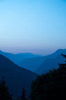 Gelaagde silhouetten in de bergen van de Franse alpen. Een verloop van donker naar licht in blauw terwijl de zon opkomt. Laagjes van voor naar achter. Een bonte parade.