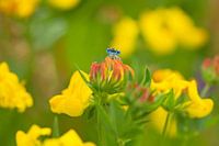 een blauwe waterjuffer op een rolklaver (lotus corniculatus)