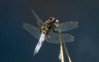 Een prachtige blauwe libellen die aan het genieten is van de zon op zijn vleugels.