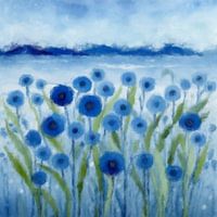 Levendige blauwe bloemen staan hoog tegen een achtergrond van een sereen meer en bergen in de verte. De compositie legt een rustige scène vast met een harmonieuze mix van blauw en groen en een vleugje eigenzinnigheid in de gestileerde flora.