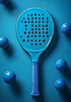 Een strakke, fotorealistische compositie van batjes en ballen in vetblauw, minimaal, modern en perfect als sportlifestyleprint of als decor naast het veld.