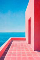 Een stralend geheel van roze muren en glinsterende zee ontvouwt zich onder de eindeloze blauwe hemel. De geometrische vormen van de architectuur harmoniëren perfect met de rust van het water, terwijl de zon zachtjes op het terras schijnt. Een gevoel van vrijheid en oneindige ruimte doordringt de ruimte. Ontspanning en inspiratie hangen…