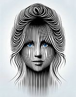 Een zwart-wit gestreept portret van een vrouw met blauwe ogen en haar haar opgestoken. Het portret is opgebouwd met zwarte strepen in verschillende diktes en lengtes. Het beeld is met behulp van ai gegenereerd.