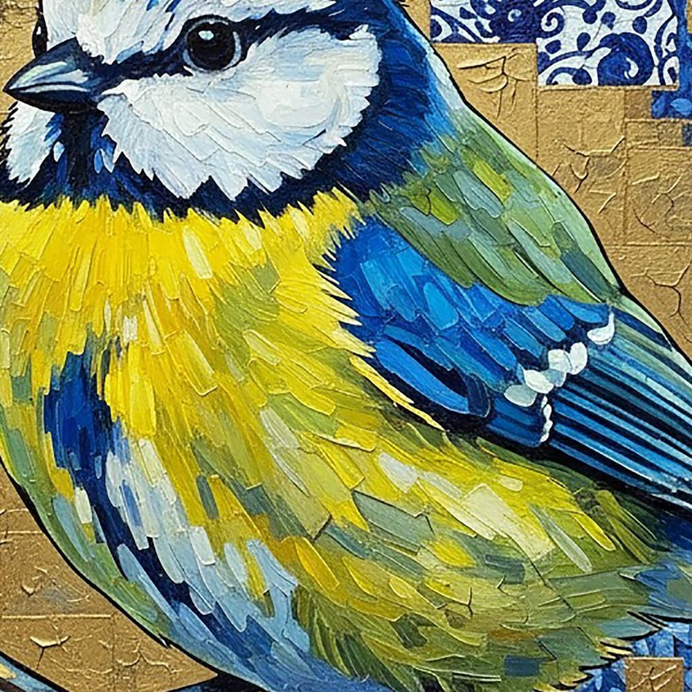 Dit schilderij combineert de vrolijke, herkenbare schoonheid van de Pimpelmees (Cyanistes caeruleus) met een weelderige, decoratieve achtergrond die een brug slaat tussen kunstgeschiedenis en Nederlands erfgoed.