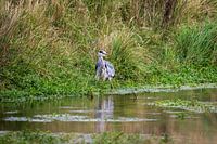 Een blauwe reiger op zoek naar eten in ondiep water in de duinen, op een mooie herfstdag.