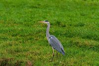 Mooi contrast tussen het groen van het het gras en de blauwe reiger. Hij staat vaak langs het water voor vis of kikkers maar ook midden in het veld kan hij op zoek naar muizen.