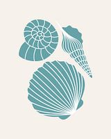 Abstracte minimalistische illustratie van blauwe schelpen met witte lijnen op een zandkleurige achtergrond.