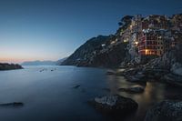 Blauwe schemering boven het vissersdorp Riomaggiore. Zeegezicht in Cinque Terre Nationaal Park, provincie La Spezia, regio Ligurië, Italië, Europa.