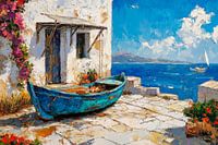 Het glinsterende blauw van het water omlijst het schilderachtige landschap, terwijl een oude, verweerde vissersboot zachtjes op de kasseien rust. Omringd door fleurige bloemen straalt de charmante witte muur van het huis in stralend licht, terwijl de wolken zachtjes over de zee drijven en de rustige sfeer van een perfecte kustidylle creëren.