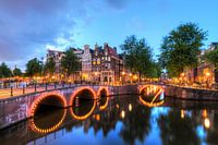 Prachtige opname van de Keizersgracht in Amsterdam na zonsondergang in het blauwe uur met lampjes op de bruggen en een mooie weerspiegeling in het water