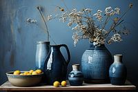 Blauwe vazen en gele citroenen vormen samen een mooi stilleven. Een leuk en fris werk in verschillende blauwtinten. Kies zelf het formaat en materiaal bij dit werk en maak het helemaal naar jouw wens!