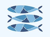 Abstracte minimalistische illustratie van drie blauwe vissen met daarin witte lijnen die de verschillende kleuren blauw scheiden . De witte randen zijn geïnspireerd op papierscheuren. De achtergrond is licht blauw.