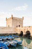 Deze foto benadrukt de combinatie van maritieme cultuur en historisch erfgoed die Essaouira zo bijzonder maakt. Met de blauwe boten op de voorgrond, de imposante stadsmuur op de achtergrond en het warme licht dat alles verbindt, laat deze scène de charme van deze havenstad zien. Perfect voor liefhebbers van Marokko, havenlandschappen en historische steden.
