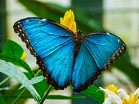 Deze vlinder zat zo mooi op de bloem, en vroeg om een foto. Deze vlinder is groter dan de meeste vlinders welke in de vlindertuin rondvlogen. Door zijn felblauwe kleur valt hij extra goed op!