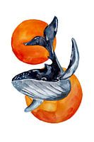 Aquarel van een grote bultrugwalvis in blauwe kleuren voor twee grote surrealistische gouden bollen.