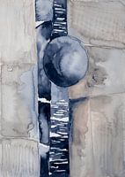 Dit aquarelkunstwerk heeft een rustige abstracte compositie rond een zachte cirkelvorm die wordt doorsneden door een verticale band. Gedempte tinten blauw, grijs en warm beige vloeien op natuurlijke wijze in elkaar over en creëren een gevoel van evenwicht, ritme en rustige diepte. De transparante aquarellaagjes en subtiele texturen…