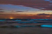 Zeevonk is een zeldzaam natuurverschijnsel dat in de nacht optreedt na paar warme dagen. In de Noordzee bij Katwijk is dit steeds vaker te zien. De blauwe kleur komt van algen die bij beweging oplichten. De rode lichtjes in de verte komen van windmolens