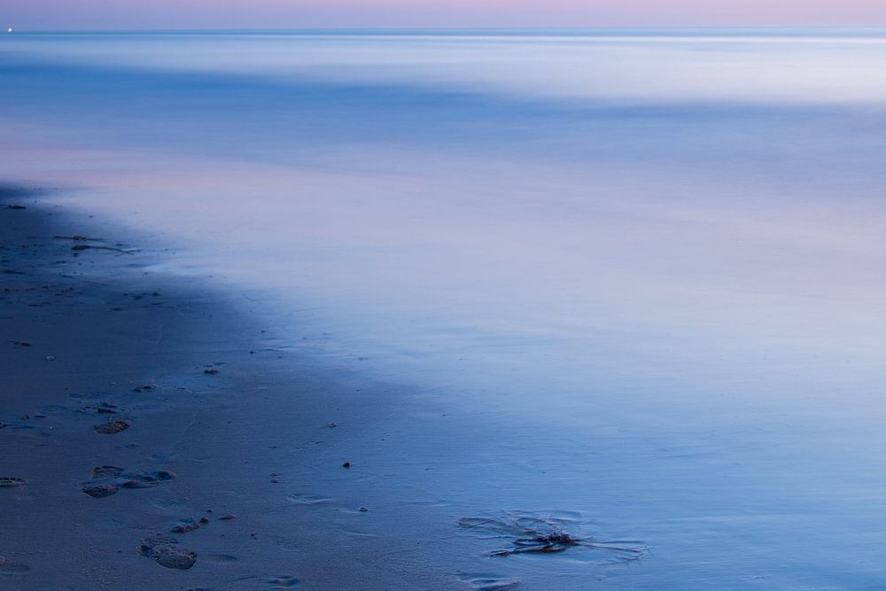 Zonsondergang tijdens het blauw kwartiertje in de branding, aan het strand bij Burgh-Haamstede