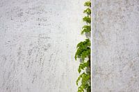 Blauweregen klimt gepleisterde muur. Een blauweregen met groene bladeren beklimt een wit geschilderde gipsen muur. De muur is verweerd en vertoont scheuren door de sterke plant.