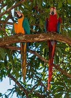 De blauwgele ara (Ara ararauna) is een papegaaiachtige uit de familie van de papegaaien van Afrika en de Nieuwe Wereld (Psittacidae). De wetenschappelijke naam van de soort werd als Psittacus ararauna in 1758 gepubliceerd door Carl Linnaeus.Blauwgele ara's worden ongeveer 76-86 centimeter lang en wegen tot 900-1300 gram. Kenmerkend is hun kleurrijke verenkleed met blauw en olijfgele vleugels en staart en een groene tip op de kop van de ara. De keel en borst is olijfgeel gekleurd. Hun snavel is zwart en zeer krachtig en in staat om grote noten te kraken. De irissen van de ogen zijn lichtgeel. De huid rondom de ogen en de snavel is naakt en wit van kleur. Bij opgewonden of gestreste vogels kan dit echter rossig van kleur zijn. Op de naakte huid zijn kleine donkere lijntjes te zien die worden veroorzaakt door korte stoppelige zwarte veertjes. Deze veerlijntjes komen samen bij de neus en keel. De krachtige poten zijn donkergrijs. Tussen het mannetje en het vrouwtje, ook pop genoemd, bestaat nauwelijks seksuele dimorfie. Het mannetje is vaak iets forser in zijn bouw en heeft meestal een iets bredere snavel.De groenvleugelara (Ara chloropterus) is een grote, kleurrijke vogel die behoort tot de familie der Psittacidae (papegaaien van Afrika en de Nieuwe Wereld). Het is de grootste soort binnen het geslacht Ara.