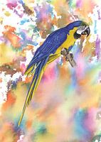 Blauwgele ara in een kleurrijke omgeving. Illustratie Jasper de Ruiter, vormgeving Merel de Ruiter.