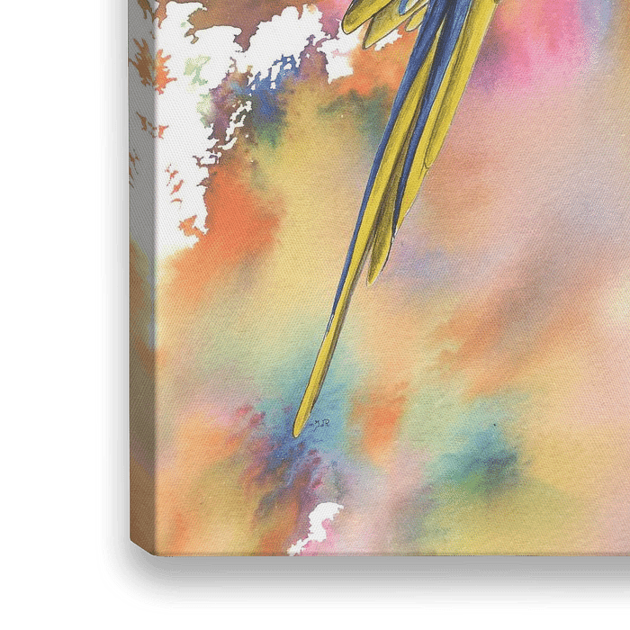 Blauwgele ara in een kleurrijke omgeving. Illustratie Jasper de Ruiter, vormgeving Merel de Ruiter.