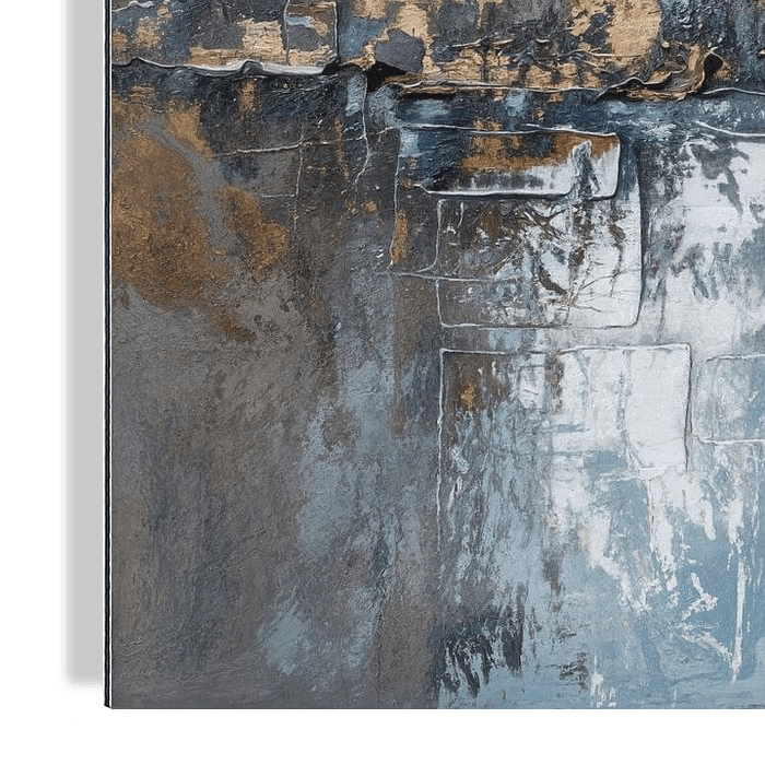 Een abstract schilderij in blauw, grijs, wit en bronsaccenten straalt een rustige en elegante sfeer uit. Dit tijdloos abstract werk brengt verstilling en harmonie en geeft de ruimte een verfijnde uitstraling.