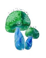 een decoratief aquarelkunstwerk van twee groen en blauw gekleurde paddenstoelen, dat lijkt op een primitieve tatoeagestijl met talrijke versieringen en patronen in het wit.