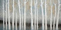 Een reeks hoge, witgeschilderde bomen met kale takken staat tegen een gedempte achtergrond van zachte grijze en blauwe tinten. Het geheel roept een gevoel op van rust en stilte in een winters bos.
