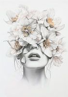 Afbeelding van een portret van een vrouw in zwart wit verscholen achter witte bloemen met een geel accent in het hart van de bloem. Verfijne zwartwit afbeelding met dunne lijntjes. Fine art. Passend bij diverse stijlen en trends, waaronder bloemen, portret, sober. Artist: Bianca ter Riet